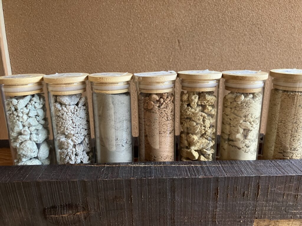 旧道の駅近くのある道を歩き山林を10分程降りていくと、このダムの辺りに到着します。七ヶ宿ダムは水質が良質だと有名で、近くで見ても透明度が高い湖が広がっています。この場所はかつて渡瀬宿があった場所で、全域が湖に沈みました。かつての面影はもう見当たりませんが、周りを取り囲む崖には、しっかりと歴史が刻まれています。採取したこのクリーム色の土は、シルト岩と呼ばれる地層で、非常に滑らかで海底地滑りによる乱流動ででき上がりました。
