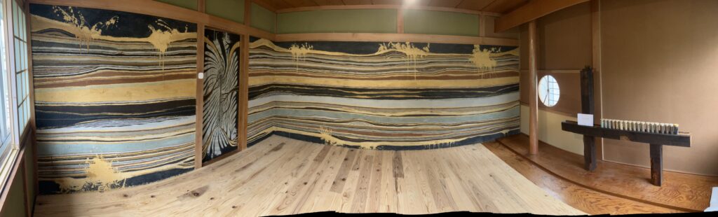 このお部屋の絵は、七ヶ宿ダムの底に沈んだ3つの集落を題材にし、その関連した地域から18種類の土と炭の素材で絵を描いています。